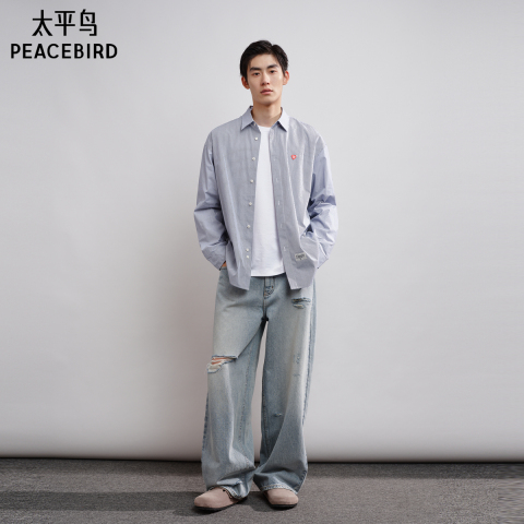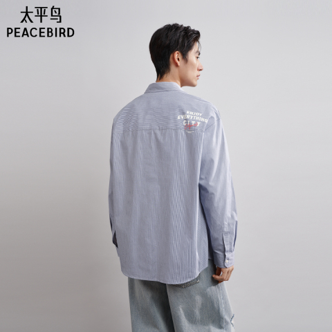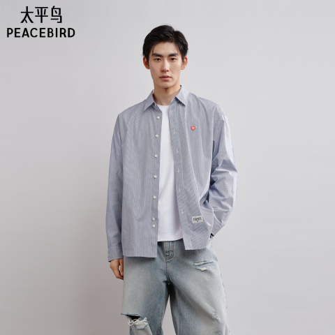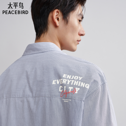 太平鸟男装 休闲衬衫春季蓝白刺绣时尚印花衬衫格纹衬衫 当季热卖