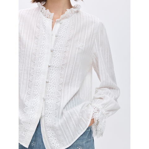 LILY立领蕾丝纯棉白色长袖衬衫