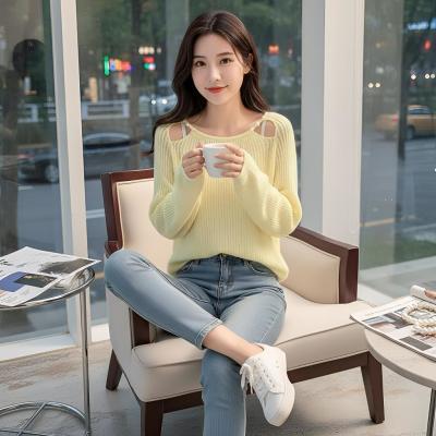 春日慵懒风长袖毛衣爆款通勤休闲韩版套头露肩针织衫心机斜领斜肩